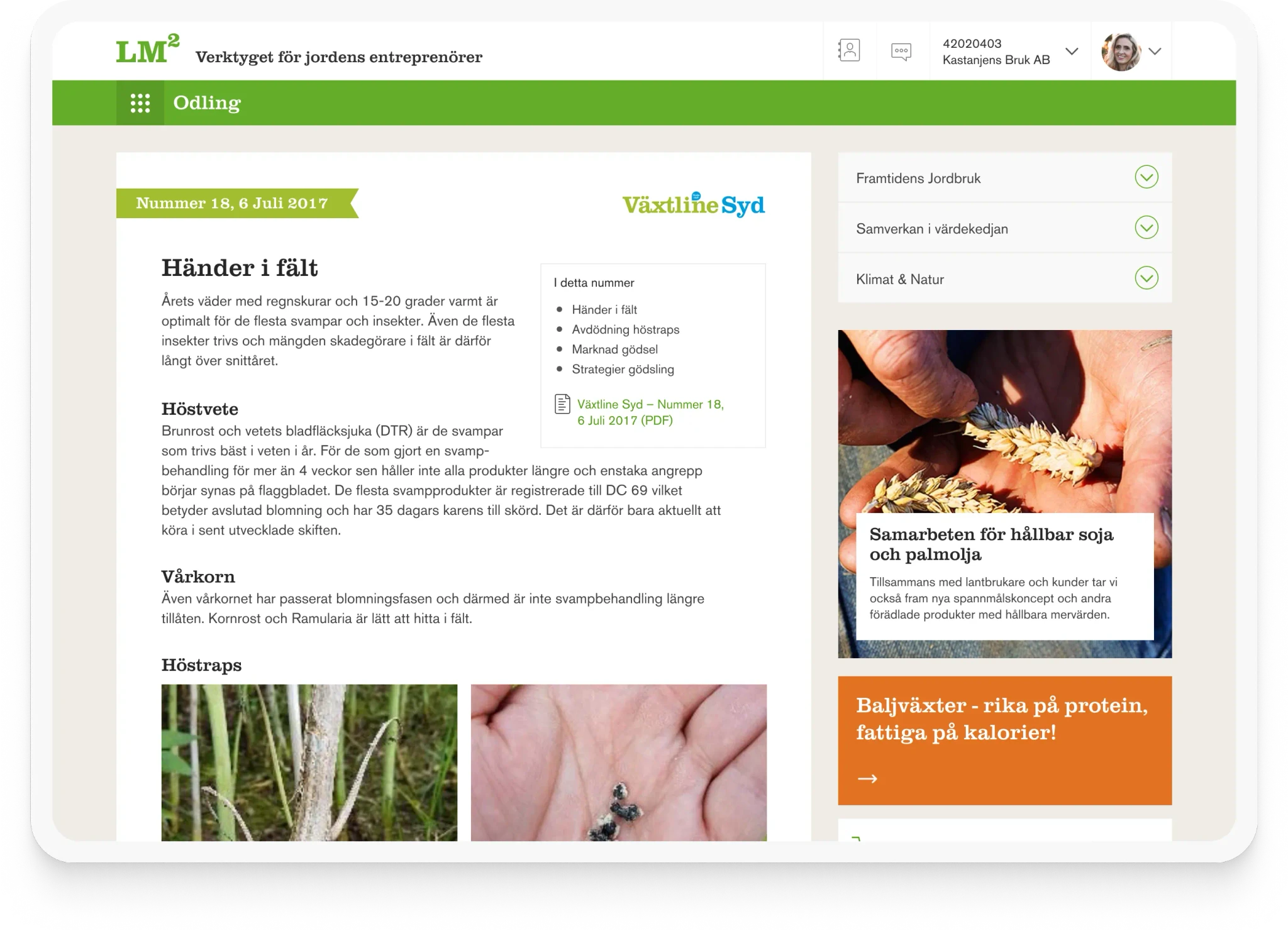 Owned by 25 000 Swedish farmers, they have over 10 000 employees and operates in 20+ countries. With the agricultural company in the center, Lantmännen gathers its entire digital offering in a new portal called LM², and takes another step in the digitalization of Swedish agriculture for increased productivity and profitability.